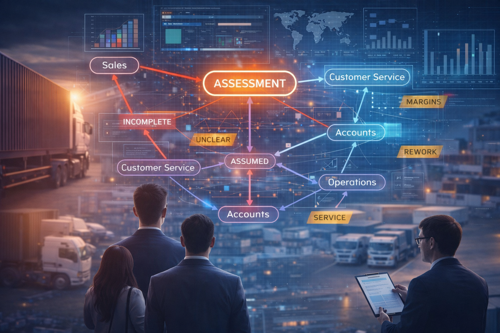 A structured assessment of how shipments and information move across the organisation. The focus is on the actual path of work—across sales, customer service, operations, accounts, and external parties such as carriers and truckers. Attention is given to where information is incomplete at handover, where clarification is repeatedly required, and where decisions rely on interpretation rather than confirmed inputs. This establishes a clear view of how context changes over the lifecycle of a shipment, where those changes begin to affect outcomes, and where control points need to be introduced. The output is a working map of operational flow, with identified points of drift, impact on margin and service, and defined conditions for continuity.