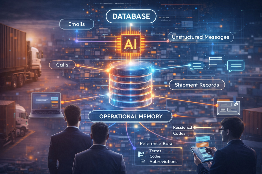 Communication is captured as part of execution and formed into structured data. Over time, this builds a shipment-level record that reflects actual decisions, instructions, and outcomes. Alongside this, a reference base develops—covering terms, codes, abbreviations, routing patterns, and recurring conditions specific to the business. This serves both human operators and AI processes. It provides a grounded reference for checks, validation, and decision support, based on how the operation actually runs rather than how it is assumed to run.
